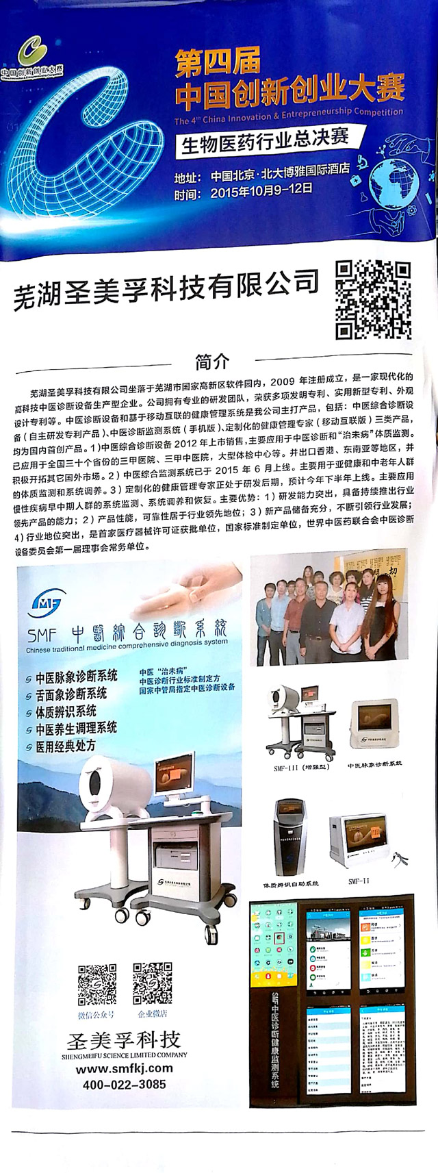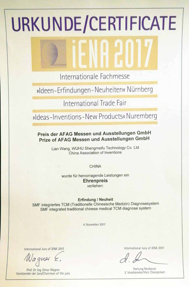 2015年,“中醫(yī)脈象診斷系統(tǒng)”、“SMF中醫(yī)舌面象儀”兩項(xiàng)產(chǎn)品入選全國(guó)衛(wèi)生產(chǎn)業(yè)管理協(xié)會(huì)首批“治未病服務(wù)適宜設(shè)備”;