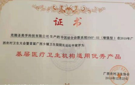 在此次大會上,蕪湖圣美孚科技有限公司生產(chǎn)的中醫(yī)綜合診斷系統(tǒng)SMF-Ⅲ(增強型)在2019年廣西農(nóng)村衛(wèi)生大會暨首屆廣西鄉(xiāng)鎮(zhèn)衛(wèi)生院院長論壇中被評為“基層醫(yī)療衛(wèi)生機構(gòu)適用產(chǎn)品”。