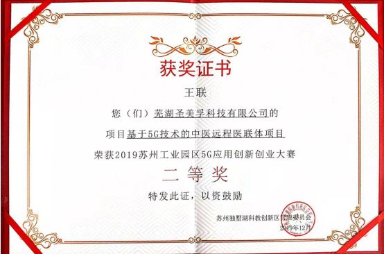 蕪湖圣美孚科技公司以“基于5G技術(shù)的中醫(yī)遠(yuǎn)程醫(yī)聯(lián)體項(xiàng)目”參加此次大賽,與參賽的各種人工智能、大數(shù)據(jù)和物聯(lián)網(wǎng)等5G示范應(yīng)用場景的高新科技項(xiàng)目同臺亮相,于決賽現(xiàn)場進(jìn)行了路演,闡述了基于5G技術(shù)的中醫(yī)遠(yuǎn)程醫(yī)聯(lián)體項(xiàng)目成果并接受大賽評委的評審問答,經(jīng)過一番角逐,我公司參賽的“基于5G技術(shù)的中醫(yī)遠(yuǎn)程醫(yī)聯(lián)體項(xiàng)目”榮獲2019年蘇州工業(yè)園區(qū)5G應(yīng)用創(chuàng)新創(chuàng)業(yè)大賽二等獎。